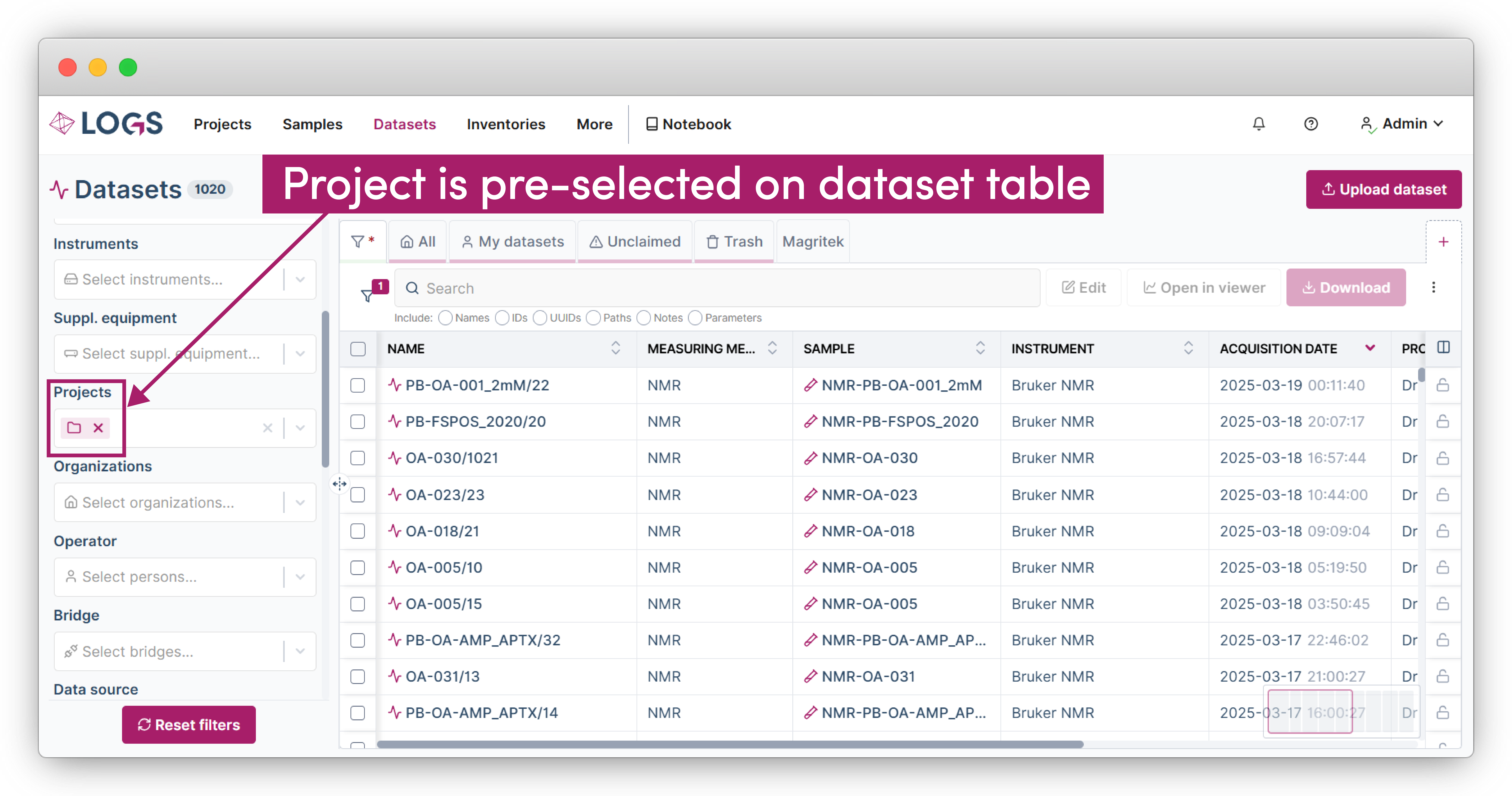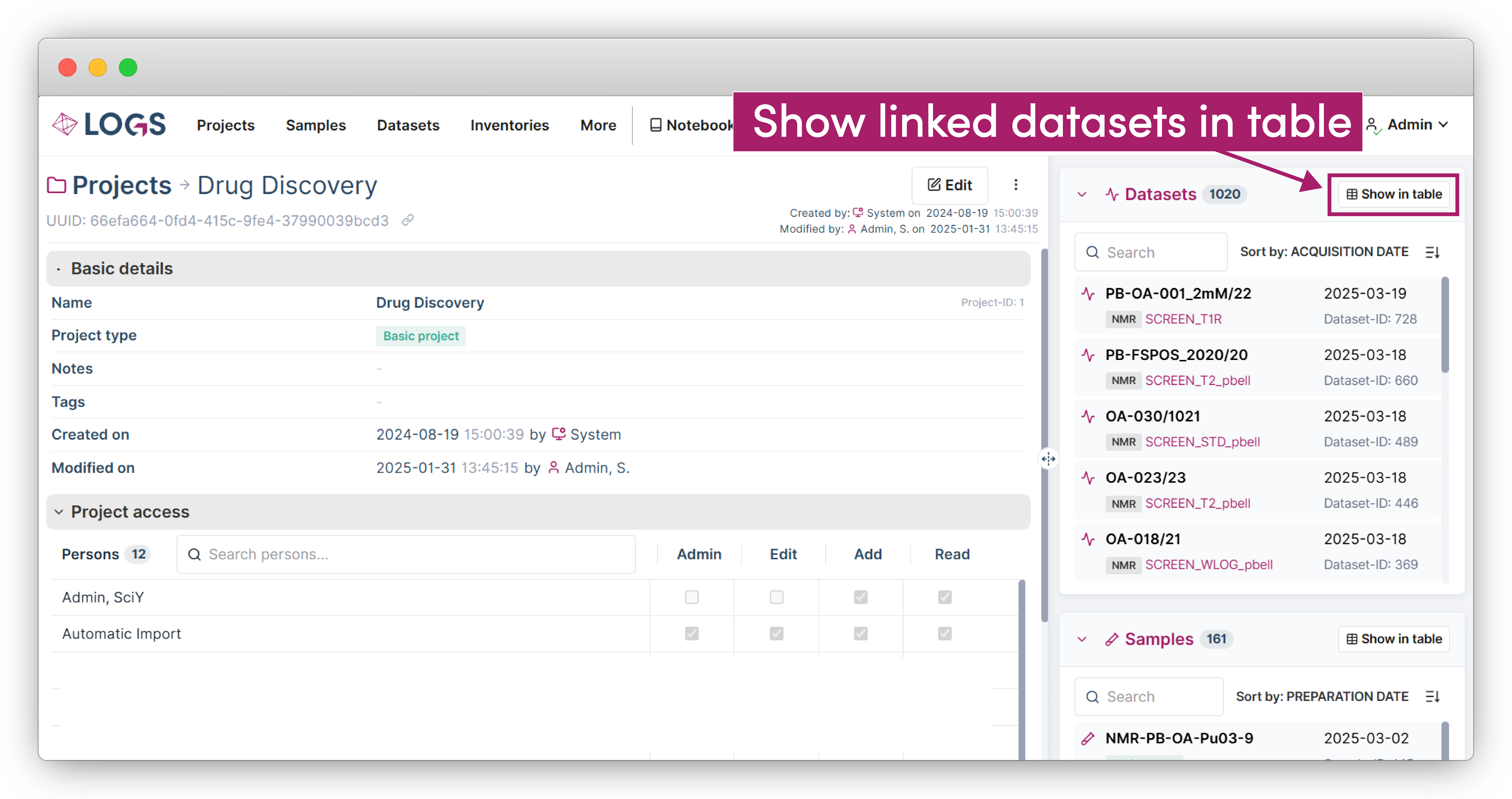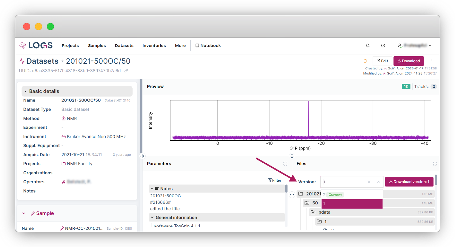 You can now access the version history of datasets, attachments, and notebook entries—making it easier to track changes, ensure transparency, and maintain data compliance. This file versioning capability is one of the key features moving LOGS towards compliance readiness. It complements our newly introduced audit trail functionality, with additional compliance-focused enhancements planned for the next release.