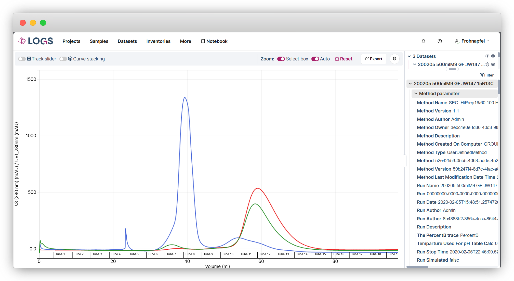 Multiviewer showing an overlay of two FPLC datasets from different instruments of different vendors.