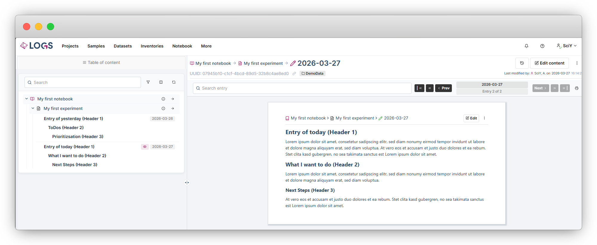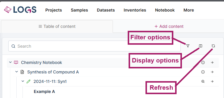 The Table of Content (ToC) provides a structured overview of the entire notebook and enables quick navigation across notebooks, experiments, and entries.