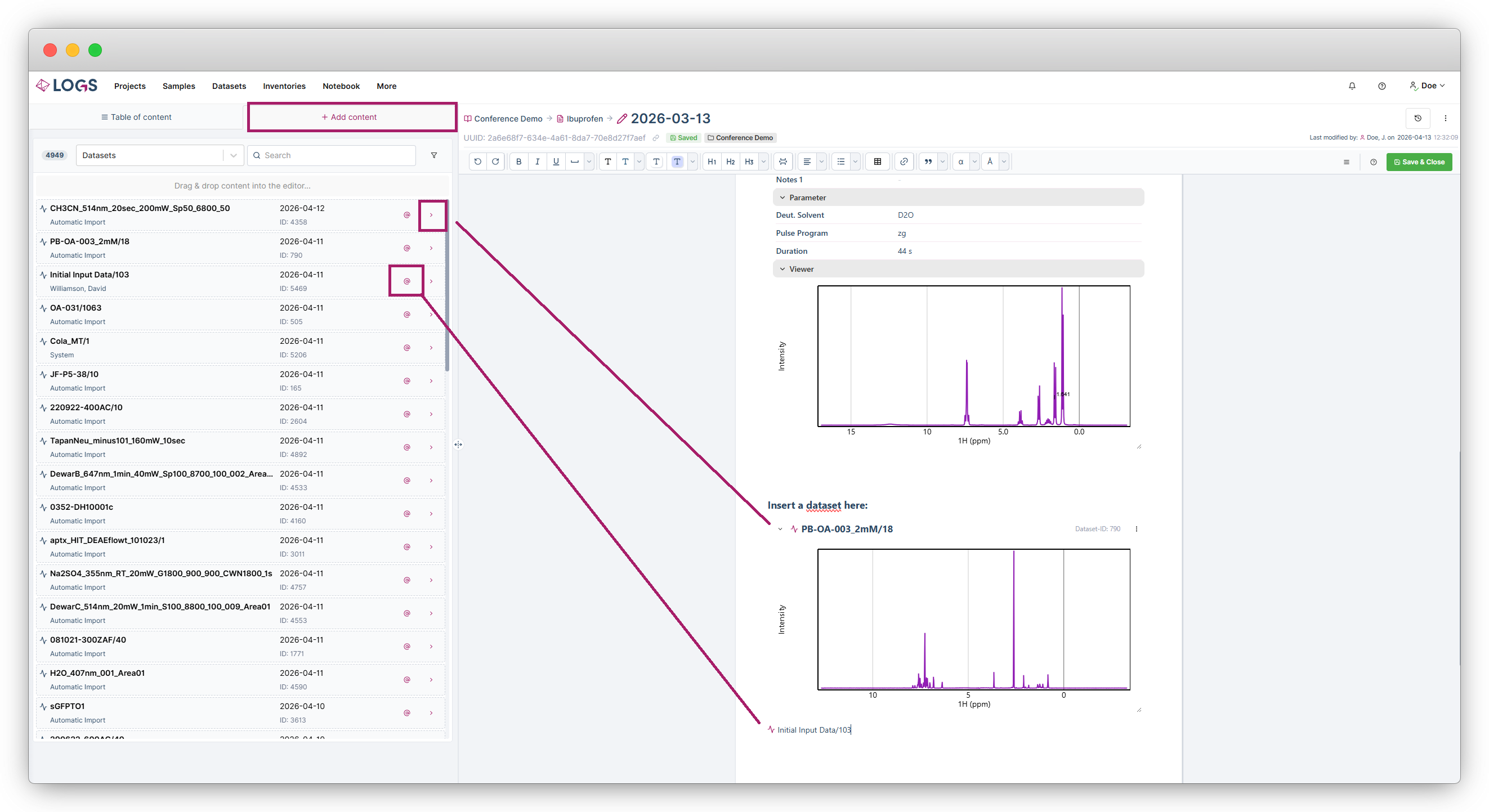 The notebook’s key functionality is referencing LOGS entities (datasets, samples, and more) to you experimental descriptions.